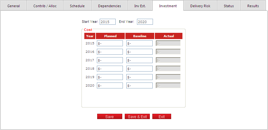 | Actual | Actual value for the investment, usually updated yearly, once actual values are available after closing the fiscal year. |