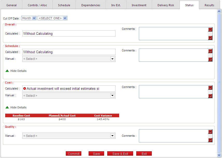 The cost status is calculated automatically when there is a baseline and a planned investment. Otherwise it can be defined manually.